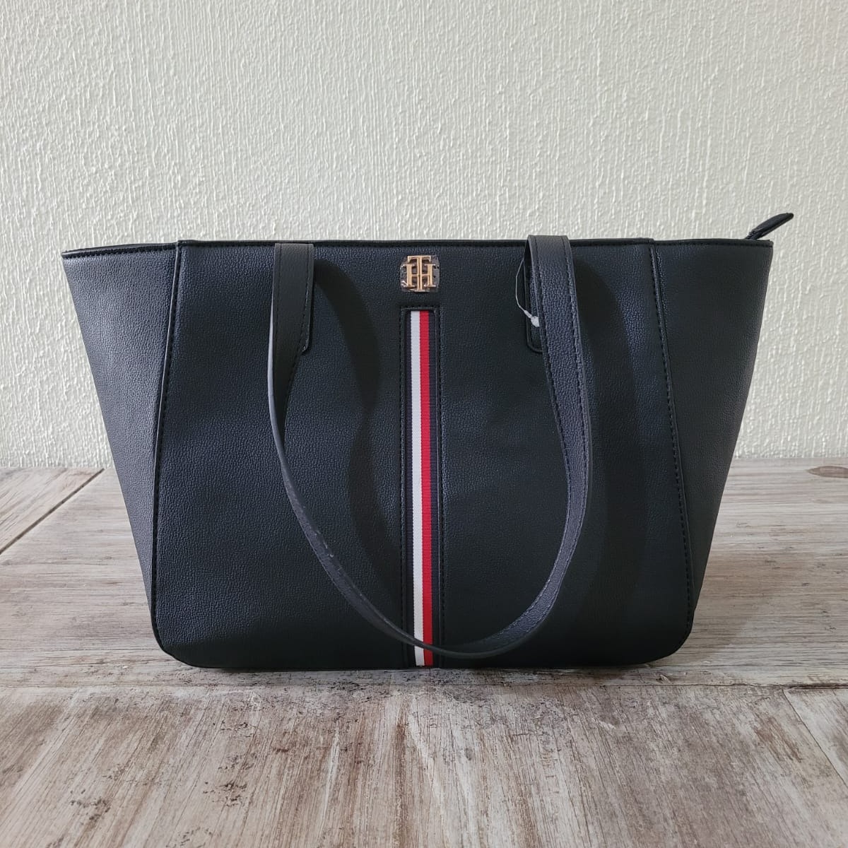 ✨ Elegancia que combina con todo. Esta bolsa negra Tommy Hilfiger con detalle tricolor es ese accesorio que eleva cualquier outfit-oficina, casual o noche.